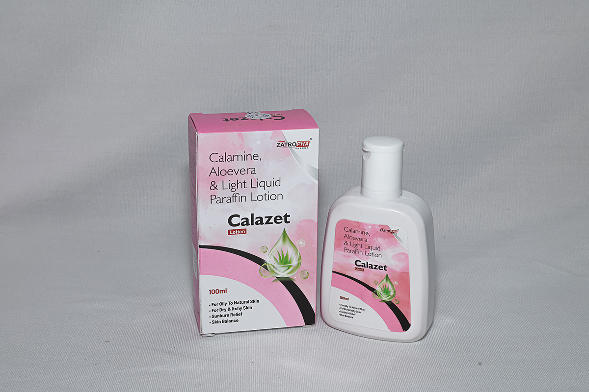 Calazet Lotion contains Calamine, Aloe Vera, and Light Liquid Paraffin, offering soothing relief from skin irritation, rashes, sunburn, and prickly heat. Its cooling and calming action helps reduce itchiness and redness.