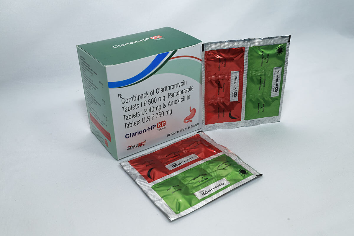 Clarion-HP Kit is a combination therapy containing Clarithromycin 500mg, Pantoprazole 40mg, and Amoxicillin 750mg. It is specifically designed to treat H. pylori infection and peptic ulcer disease. This triple therapy works synergistically to eradicate bacteria and promote gastric healing.