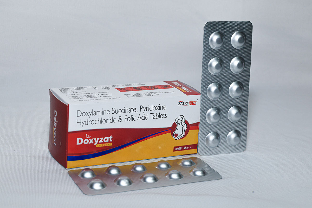 Doxyzat contains Doxylamine 10mg, Pyridoxine (Vitamin B6) 10mg, and Folic Acid 2.5mg—recommended for managing nausea and vomiting during pregnancy (morning sickness). It is a safe and effective formulation commonly used in early pregnancy.