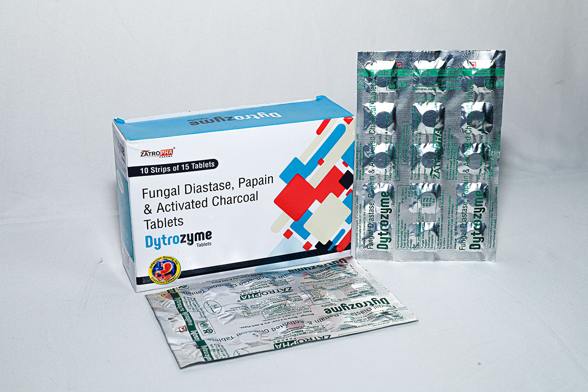 Dytrozyme Tabs contain Fungal Diastase 100mg, Papain 60mg, and Activated Charcoal 75mg. This digestive enzyme blend helps relieve indigestion, bloating, gas, heaviness after meals, and digestive discomfort.