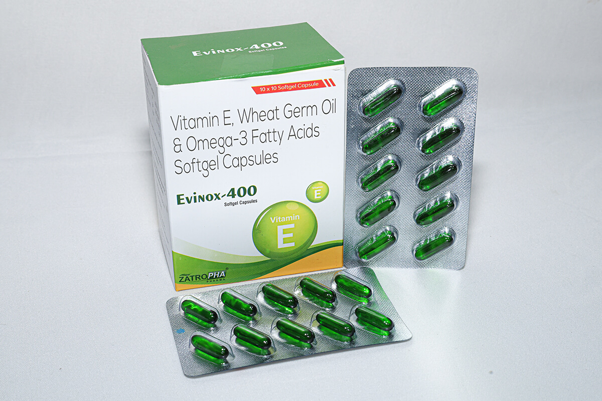 Evinox-400 contains Vitamin E 400 IU, Omega-3 fatty acids, and Wheat Germ Oil to support skin health, hair strength, heart health, and antioxidant protection. It helps reduce oxidative stress and supports cellular repair.