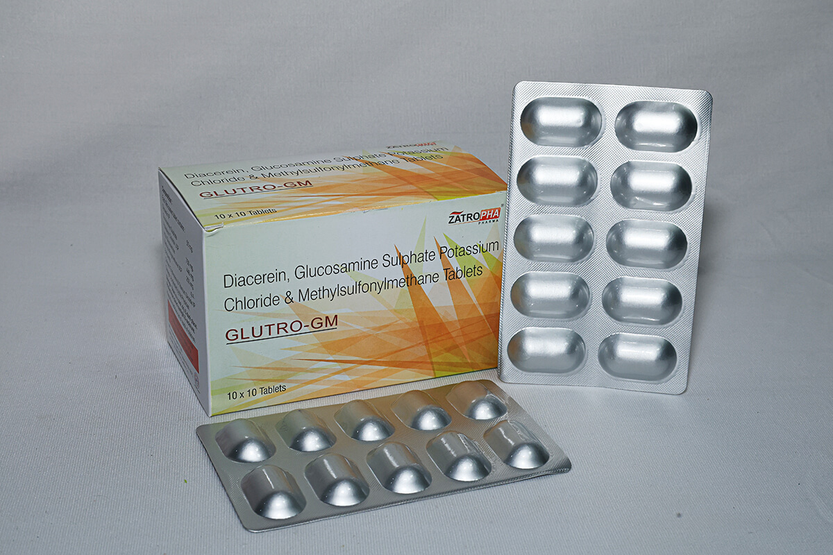 Glutro-GM contains Diacerein 50mg, Glucosamine Sulphate 750mg, and MSM 250mg, formulated for osteoarthritis, joint pain, stiffness, and cartilage degeneration. It supports joint lubrication, mobility, and long-term cartilage protection.