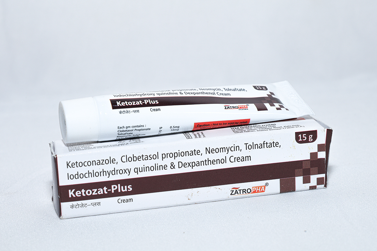 Ketozat-Plus Cream is a multi-action antifungal and antibacterial formulation containing Ketoconazole, Iodochlorhydroxyquinoline, Tolnaftate, Neomycin Sulphate, Clobetasol, and Dexpanthenol. It effectively treats complex skin infections with inflammation and itching.
