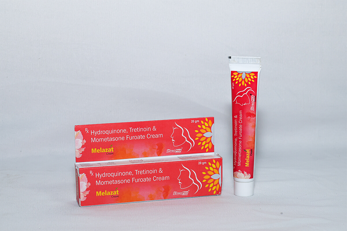 Melazat Cream contains Hydroquinone, Tretinoin, and Mometasone Furoate, a dermatologist-approved triple combination for hyperpigmentation, melasma, dark spots, and uneven skin tone. It helps lighten pigmentation while improving skin texture.