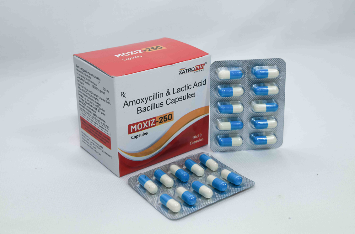 Moxiz-250 contains Amoxycillin Trihydrate 250mg with Lactic Acid Bacillus, making it a balanced antibiotic formulation ideal for respiratory, ENT, urinary, and skin infections. The probiotic support reduces digestive disturbances, ensuring better patient comfort during antibiotic therapy.