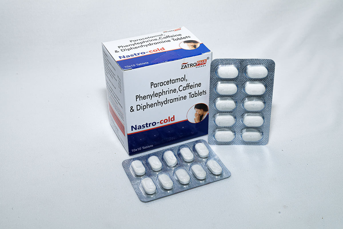 Nastro-Cold contains Paracetamol 325mg, Phenylephrine 5mg, Caffeine 30mg, and Diphenhydramine 25mg. It provides full-spectrum cold relief by addressing fever, nasal congestion, headaches, fatigue, and allergic symptoms associated with viral infections.