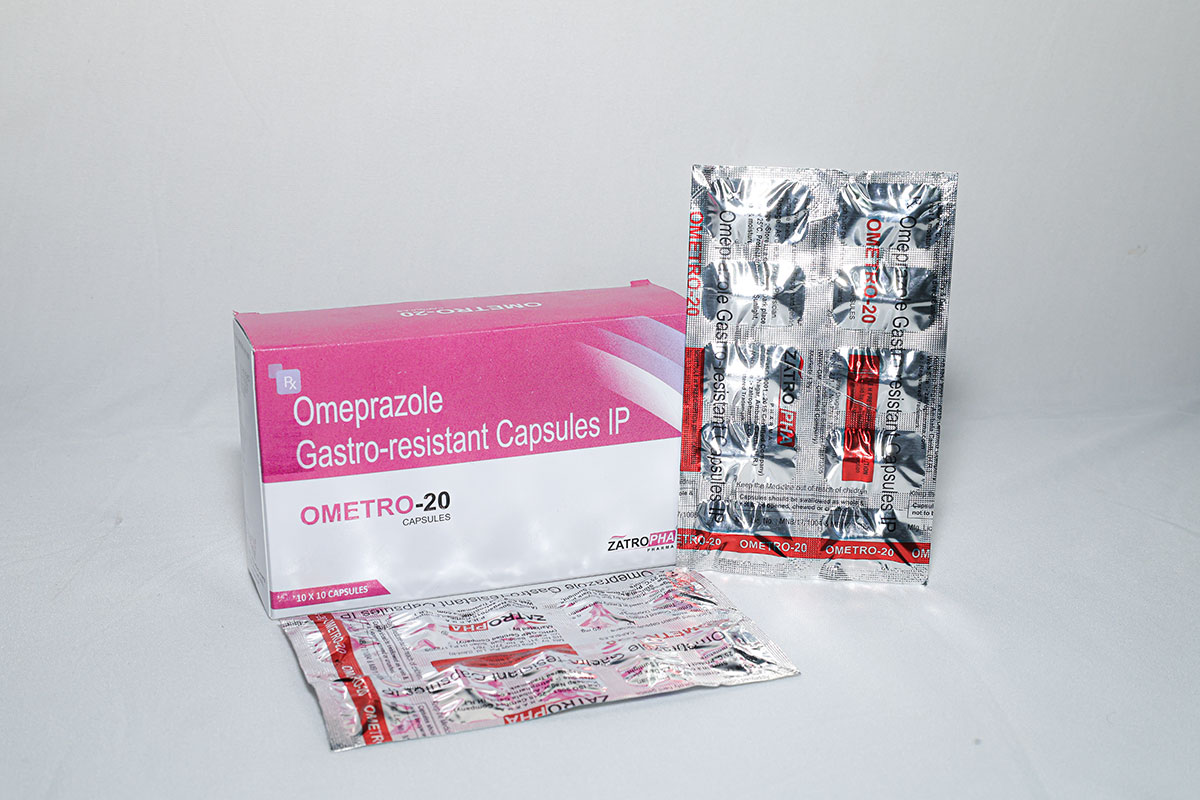 Ometro-20 contains Omeprazole 20mg, used for acidity, heartburn, gastric ulcers, and GERD. It suppresses stomach acid production and eases irritation.