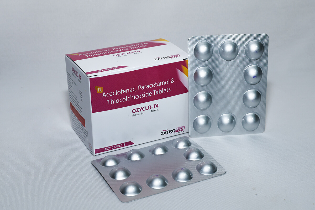 Ozyclo-T4 combines Aceclofenac 100mg, Thiocolchicoside 4mg, and Paracetamol 325mg for greater relief from severe pain, muscle stiffness, and inflammation. It is highly effective for sports injuries, cervical pain, lower back pain, and joint pain.