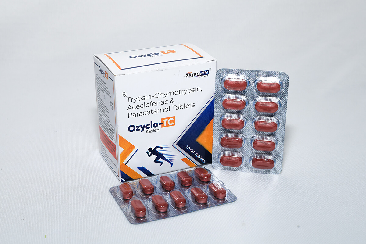 Ozyclo-TC contains Trypsin & Chymotrypsin 50,000 IU, Aceclofenac 100mg, and Paracetamol 325mg. It is an advanced anti-inflammatory and analgesic formulation designed to treat swelling, injuries, trauma, and orthopedic pain.