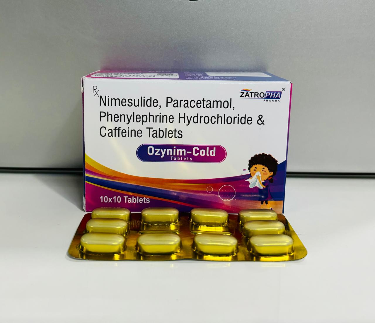 Ozynim-Cold contains Nimesulide 100mg, Paracetamol 325mg, Phenylephrine 10mg, and Caffeine 25mg, designed for fast relief from cold, fever, nasal blockage, headaches, and body pain. It offers a strong anti-inflammatory and decongestant effect.