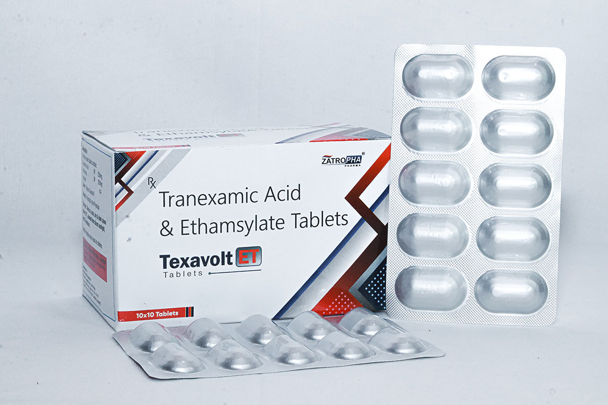 Texavolt-ET contains Tranexamic Acid 250mg and Etamsylate 250mg, a synergistic combination for managing heavy menstrual bleeding and abnormal uterine bleeding.