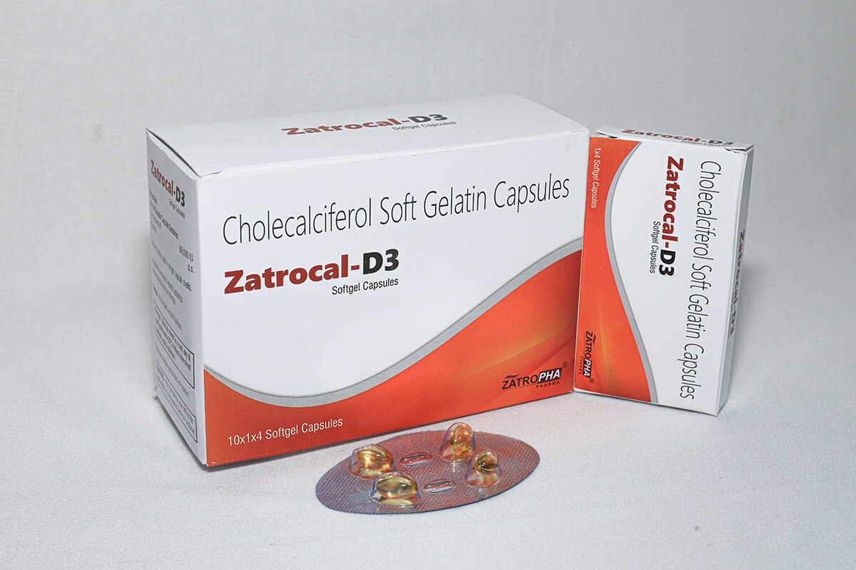 Zatrocal-D3 contains Cholecalciferol (Vitamin D3) 60000 IU softgels used to treat vitamin D deficiency, weak bones, muscle pain, and fatigue. It enhances calcium absorption and improves bone strength.