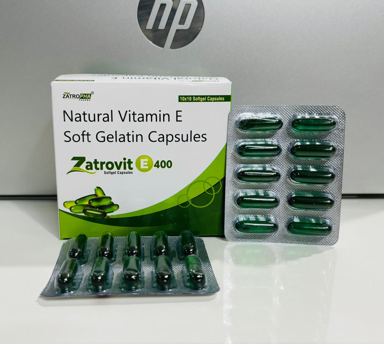 Zatrovit-E 400 contains Natural Vitamin E 400mg Softgels, a powerful antioxidant supplement that helps protect body cells from oxidative damage and supports overall health.